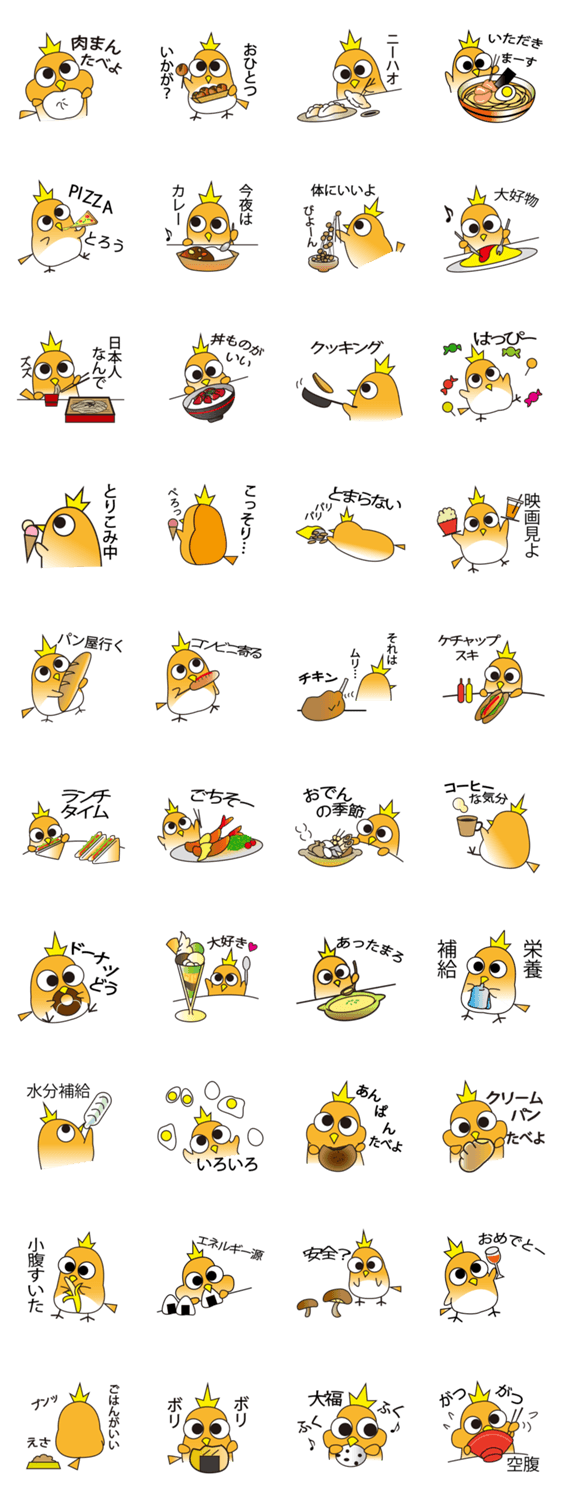 | スタンプ説明 | コトリです。カンムリ被っているけど一般人(イッパンドリ)です。コトリちゃんは人間の食べ物が大好き。食べて食べて、食べて…元気いっぱい! |