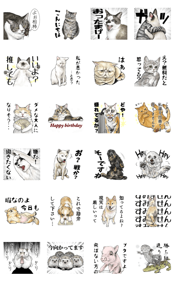 猫派じゃなくても意外と使えるリアル愛玩動物スタンプ。犬・うさぎ・ハムスター・ハリネズミ・ブタ・ウーパールーパーも居ます。しかし半分以上猫です。猫尊い。