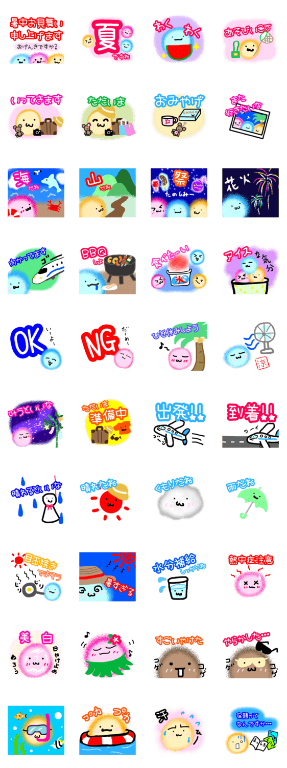 暑中お見舞い申しあげます。ゆるっとかわいい彼らにも夏がやって来ました。おいしいもの食べたり、お祭りや花火に行ったり。お天気や夏休みの日常やイベントにも。