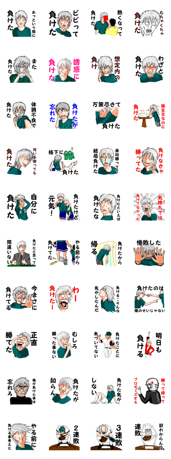 | スタンプ説明 | 人生は勝ったり負けたりのリーグ戦。スポーツにゲームに試験、様々な「負け」に対応したスタンプです。負かした相手にプレゼントして煽るのは厳禁(笑) |