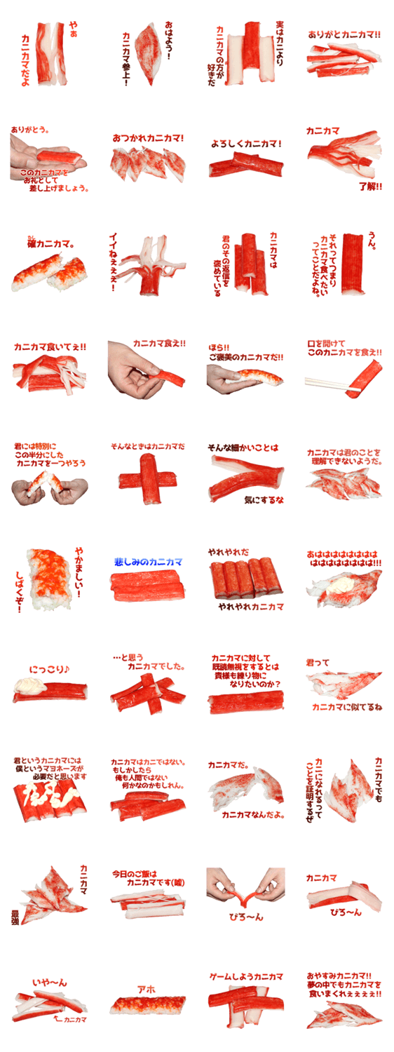 かにかまの写真で作ったスタンプです。そのままでもサラダなどに入れても美味しいカニカマをどうぞ。蟹、練り物、魚介類、かまぼこ、カマボコ。超高画質。実写食べ物面白い
