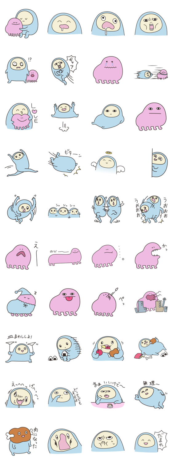 水色のうちゅうじんくん(地球人)と紫色のあるくくん(なめくじ)の楽しいスタンプが出ました!あるくくんは潰れやすい性質なので取扱いには十分な注意が必要です。
