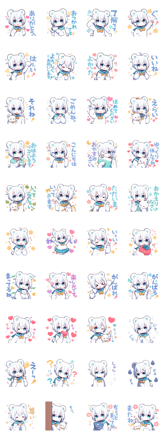 しろくまの女の子のスタンプです。毎日使えるリアクションや挨拶が沢山入っています。友達や家族、恋人との会話に是非。
