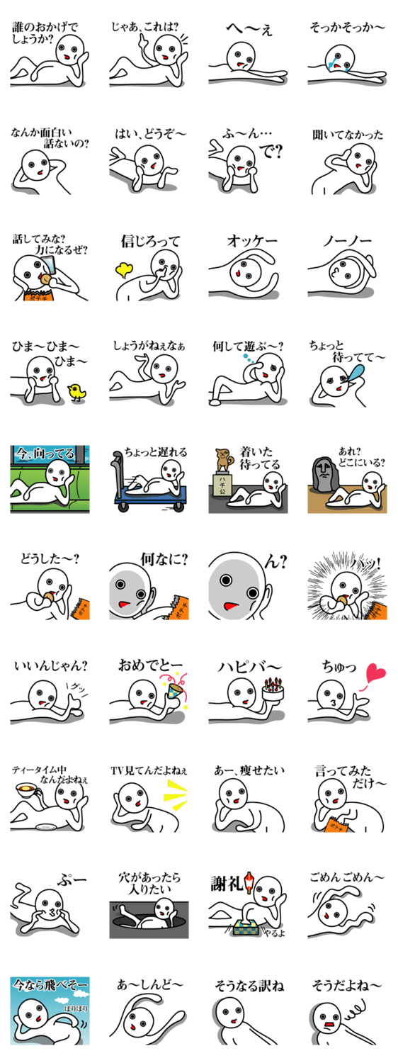 何を言うにも無表情で『寝ころびながら』。ちょっと自分勝手でテキトーなヤツのLINEスタンプ。ゆるく、楽しく使ってね。