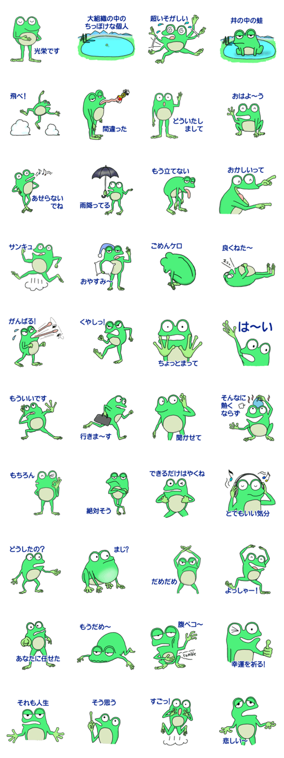 | スタンプ説明 | びっくりしたようなまんまるの目な動物たちの世界から、カエルくんがLINEスタンプに登場です。 |