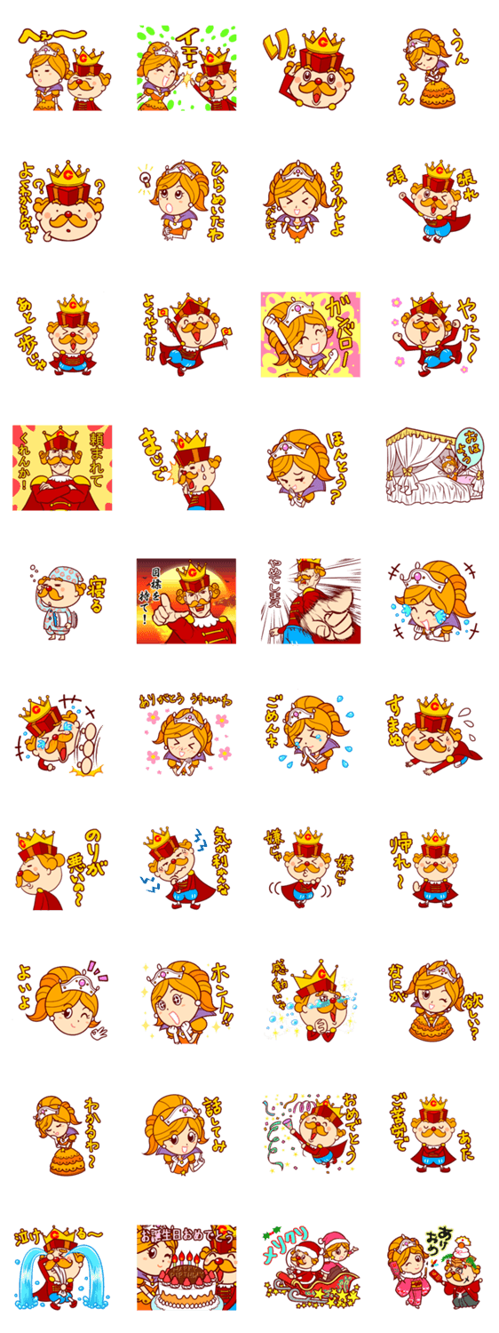 | スタンプ説明 | ギフトの王國:ギフトゥン・オークルンジャ国王とパットリーナ・ヒーラメイタ姫。二人は、とてもお茶目で楽しく感情豊か。人生の目標は、ご褒美で世界征服。 |