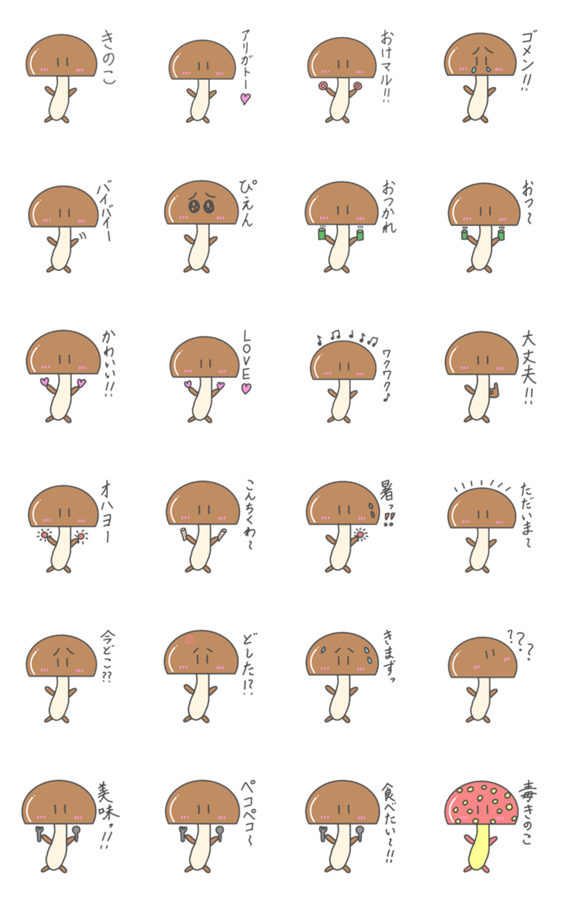 きのこがモチーフのかわいいスタンプです。LINEスタンプメーカーでつくったスタンプです。