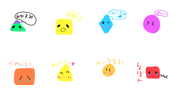 いろんなかたちに顔があるスタンプです。いろんな人に使ってほしいです。小学1年生が作ったスタンプです。