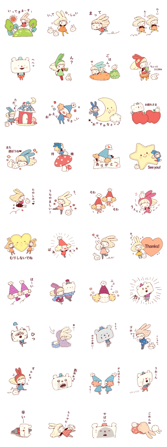 うさ耳の女の子、クマ、ふわふわうさぎ、小人。毎日使える可愛い日常スタンプです。