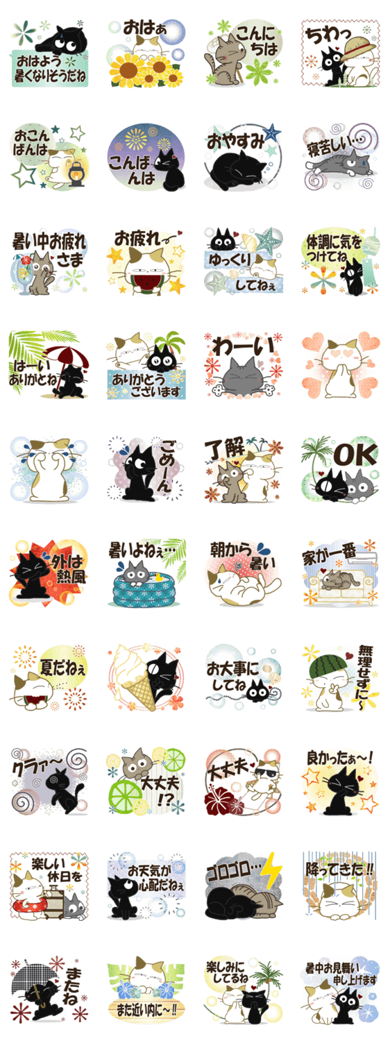 黒ねこちゃん達とみけさんのコラボ日常スタンプ 夏編です!