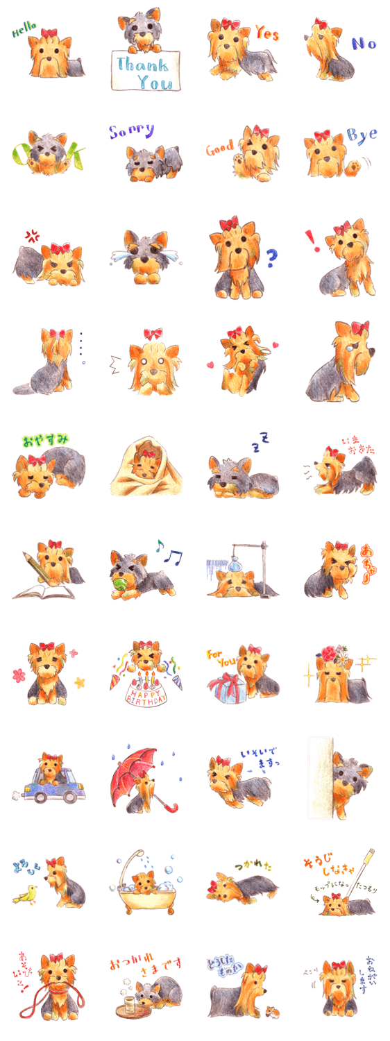| スタンプ説明 | 長毛犬種 ヨークシャーテリアのスタンプです。色鉛筆の柔らかな雰囲気のわんこで、会話もほっこり? |