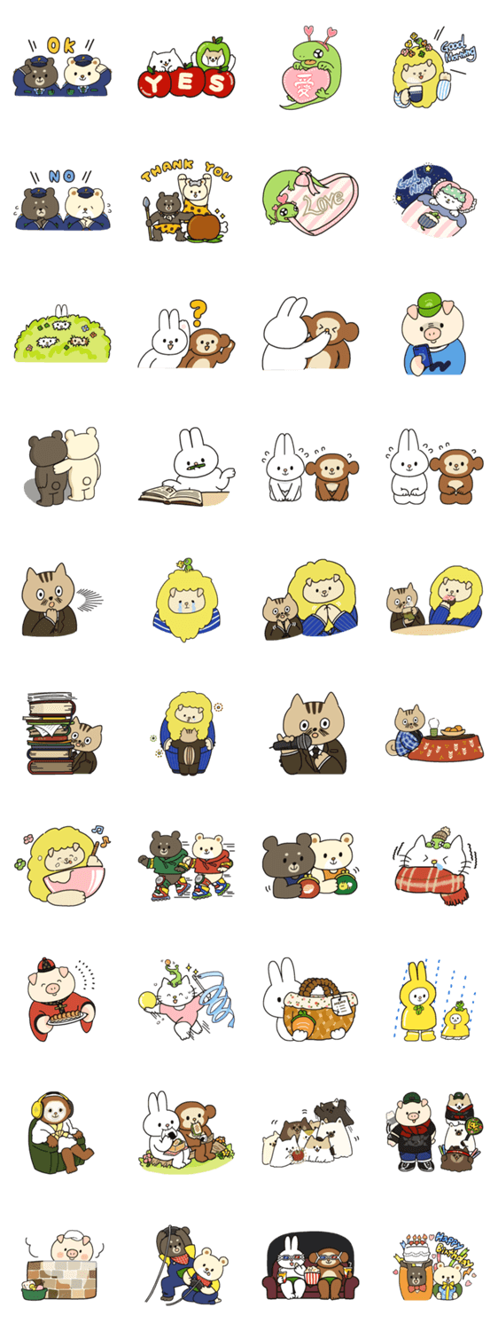 うさぎのホーリーとおさるのテンジクを中心に、もりもり森の仲間たちが会話をゆるーく彩ります。