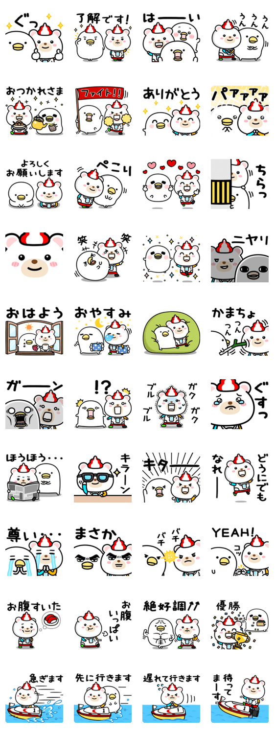 ボートレースの愛されキャラクター「クマホン」とうるせぇトリのコラボスタンプです。