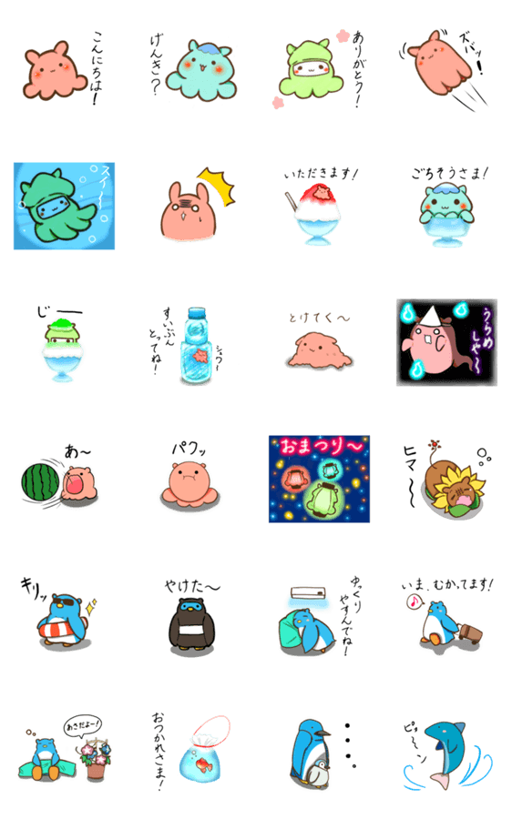 | スタンプ説明 | メンダコさん達が夏をまんきつしているスタンプです!全部ひらがなを使っていますので、小さいお子様でも使いやすいようなっていると思います。 |