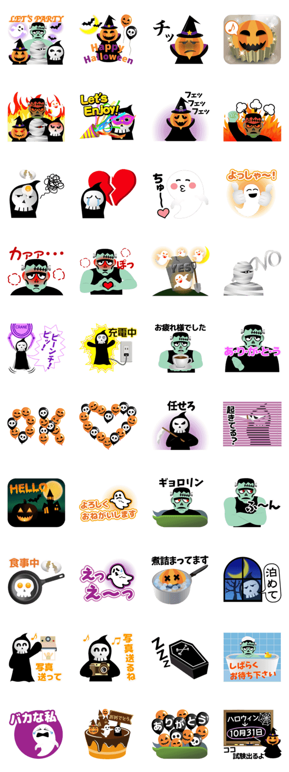 | スタンプ説明 | 秋の夜は長い。賑やかな仲間達がハロウィンパーティーを聞きつけて大集合。さあ皆も声掛け合って誘ってみよう。ガイコツやお化けやフランケンも浮かれ出す。皆で一緒にGO! |