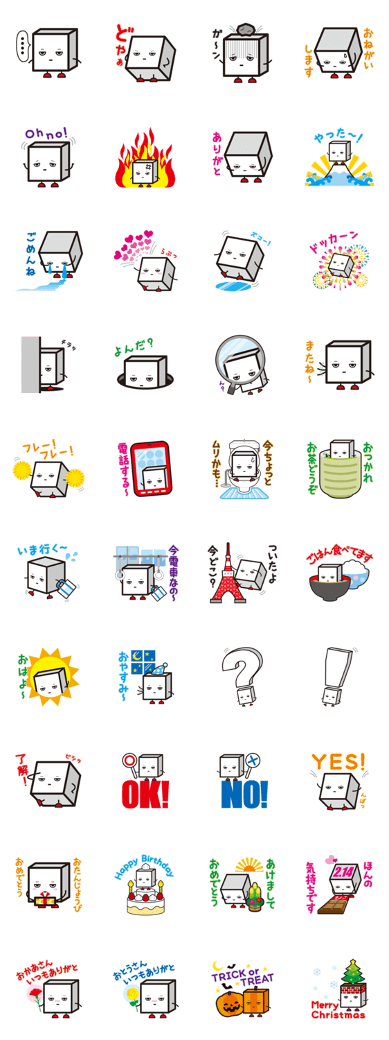 豆腐じゃないよ、ハコくんだよ。はんぺんでもないよ、ハコくんだよ。白いオバケ?ううん。四角い段ボール箱?ううん。違うよ、僕はハコくんだよ。僕のスタンプ使ってね。
