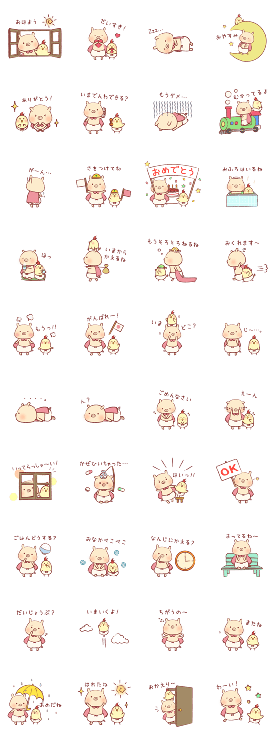 とてらぽってのスタンプ第一弾!ヒーローに憧れる好奇心旺盛な「ぶーちゃん」と、にわとりになりきれず、いつかにわとりになりたい「ちきん」の、ほんわかスタンプです。
