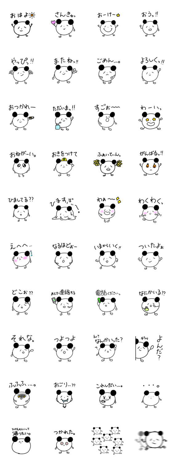 | スタンプ説明 | ぱんだみたいなぱんだが頑張っています。挨拶からはじまり使いやすいものを集めました! |