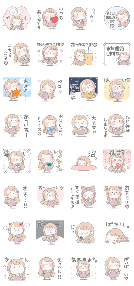 くすみカラーの女の子のゆるくてかわいいスタンプだよ! 毎日使える便利な言葉がたくさん♪ 大人可愛い/おんなのこ/くすみパステル/推し