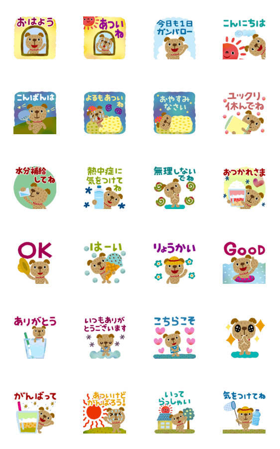 元気いっぱいなちびいぬワンタンの飛び出す夏スタンプです。 おはよう、ありがとう、よろしくなど日常会話に使いやすいフレーズです。