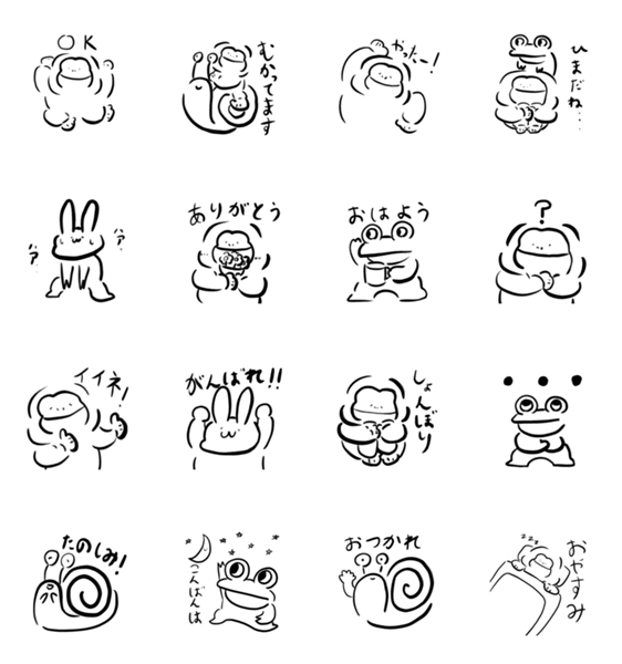 LINEスタンプメーカーでつくったスタンプです。さるのともだちには、かえると、うさぎと、かたつむりがいます。