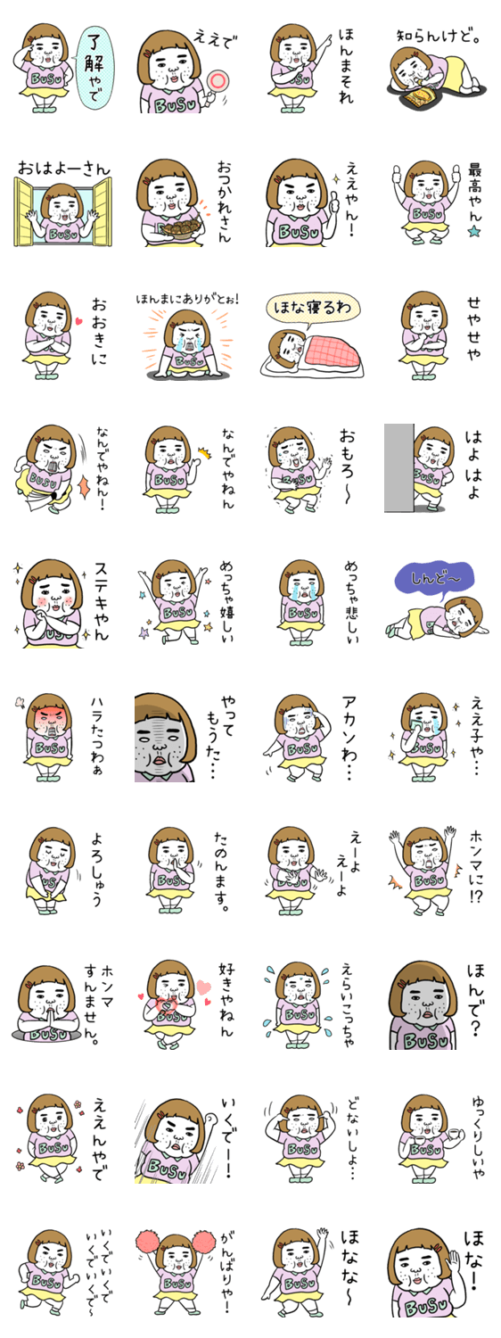 憎めないブスの関西弁スタンプです。日常会話や挨拶には勿論、恋人友達家族や仕事仲間に!ブサイクだけど愛嬌がある自虐大人女子ネタスタンプ!毎日使えるよ!