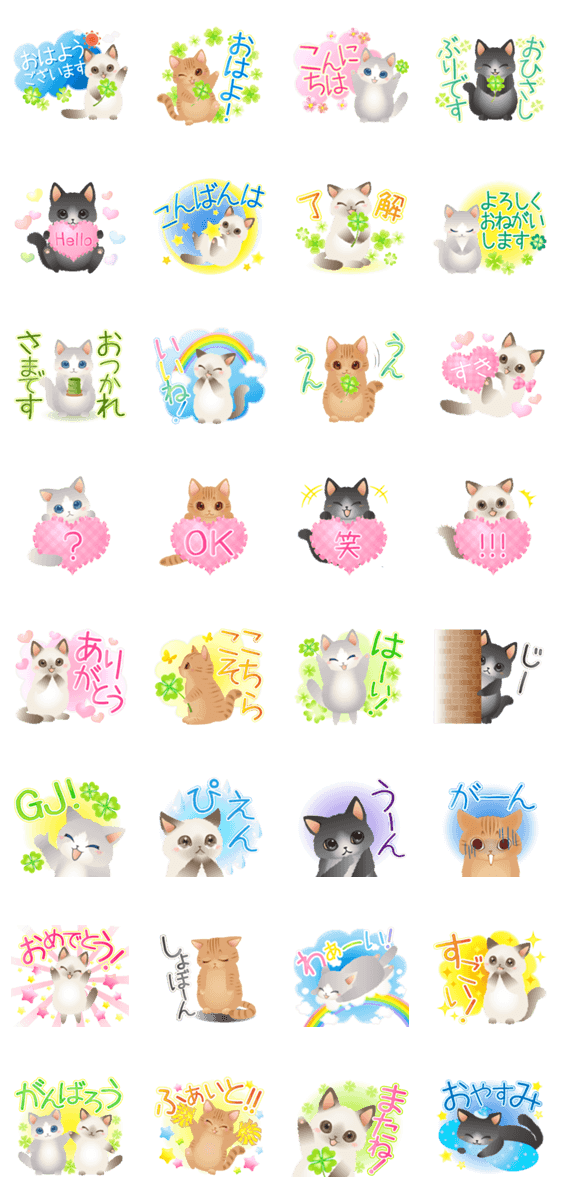 幸運モチーフのクローバーとふわふわもふもふなねこたちの毎日使えるスタンプセット!ずっと使えて便利なメッセージが揃ってます!