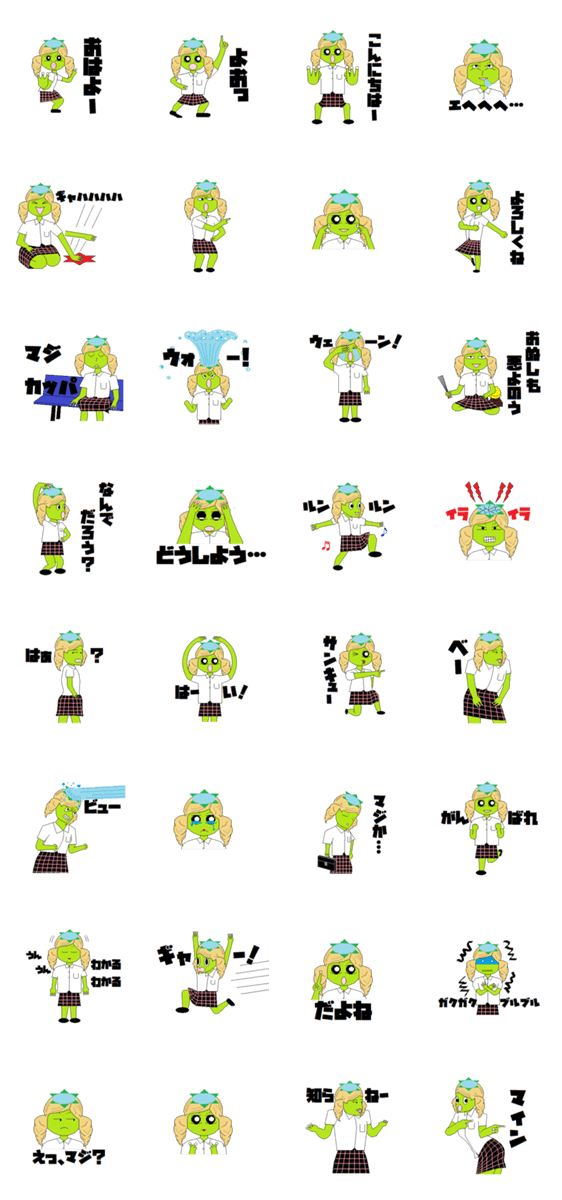 | スタンプ説明 | カッパの面白いスタンプです。 かわいいJKのカッパがおもしろいことを言います。 |
