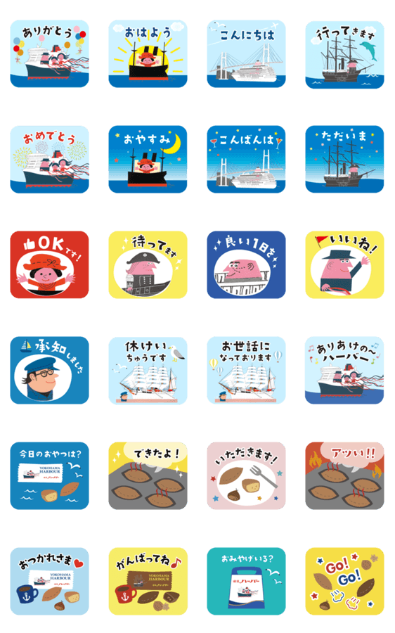 ありあけハーバー公式スタンプが初登場! パッケージでお馴染みの柳原良平氏のイラストと新たに書き起こしたオリジナルデザイン。日常会話にも使える可愛いスタンプです!