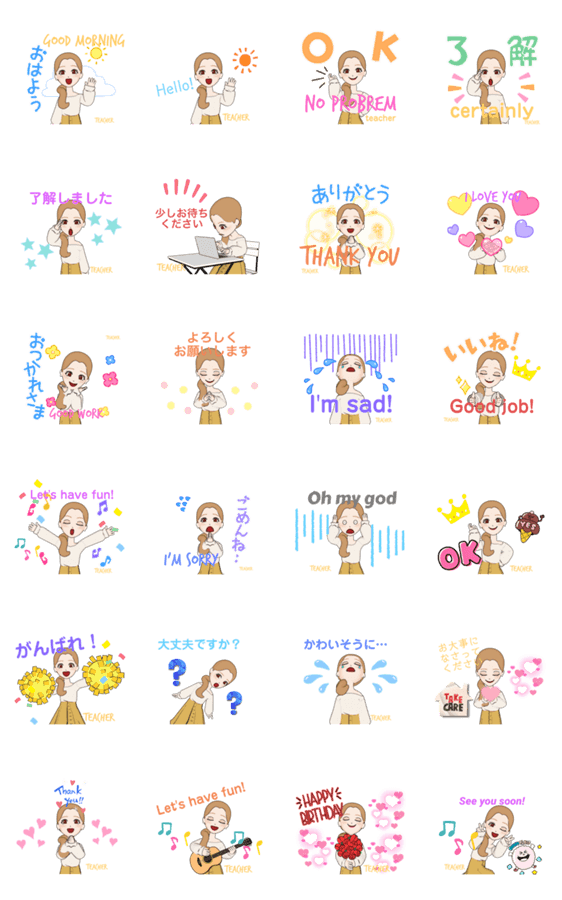 | スタンプ説明 | 英語の先生、塾の先生など、お稽古事の先生から保護者の方、生徒、子供たちに向けてのスタンプです。 |