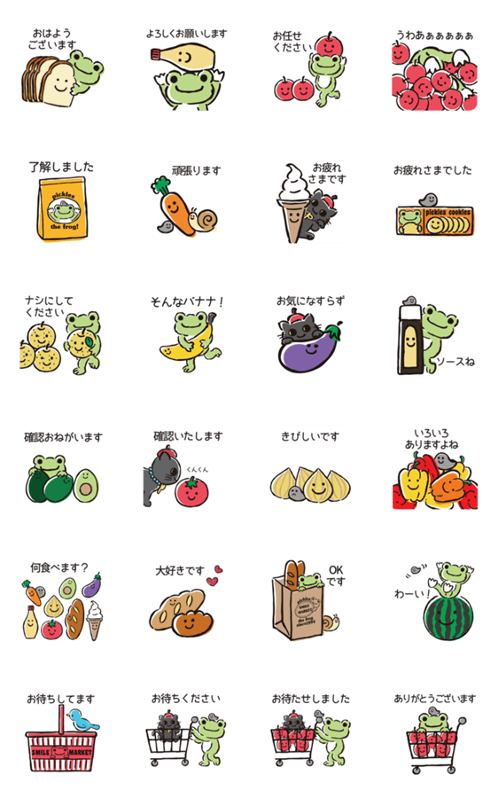 | スタンプ説明 | 日常使いやすいスタンプです。スーパーマーケットデザインなので野菜ネタも! |