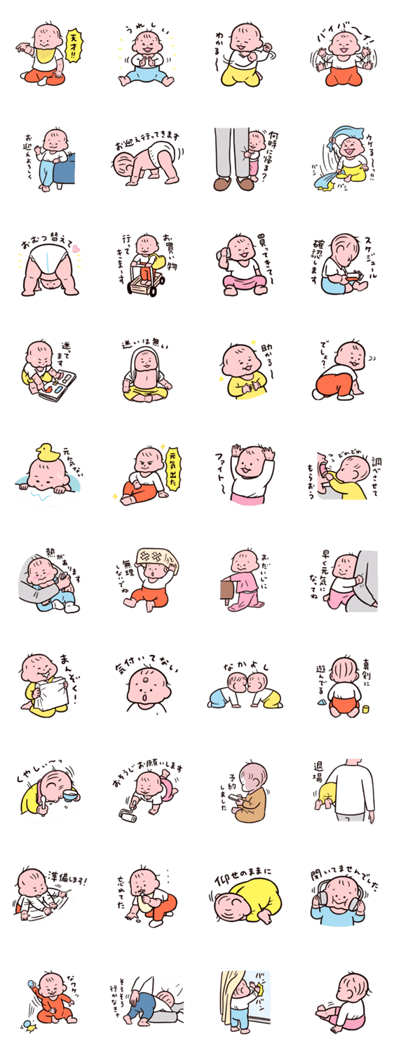 赤ちゃんの仕草をスタンプにしました。 生まれたて=毎日が新しい日々。 好評につき第7弾です。日頃使うような会話を盛り込んでみました。