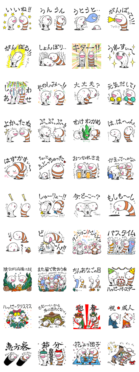 珍アナゴの癒されるキャラがかわいい、日常すぐ使える会話や季節もののスタンプ第2弾です。