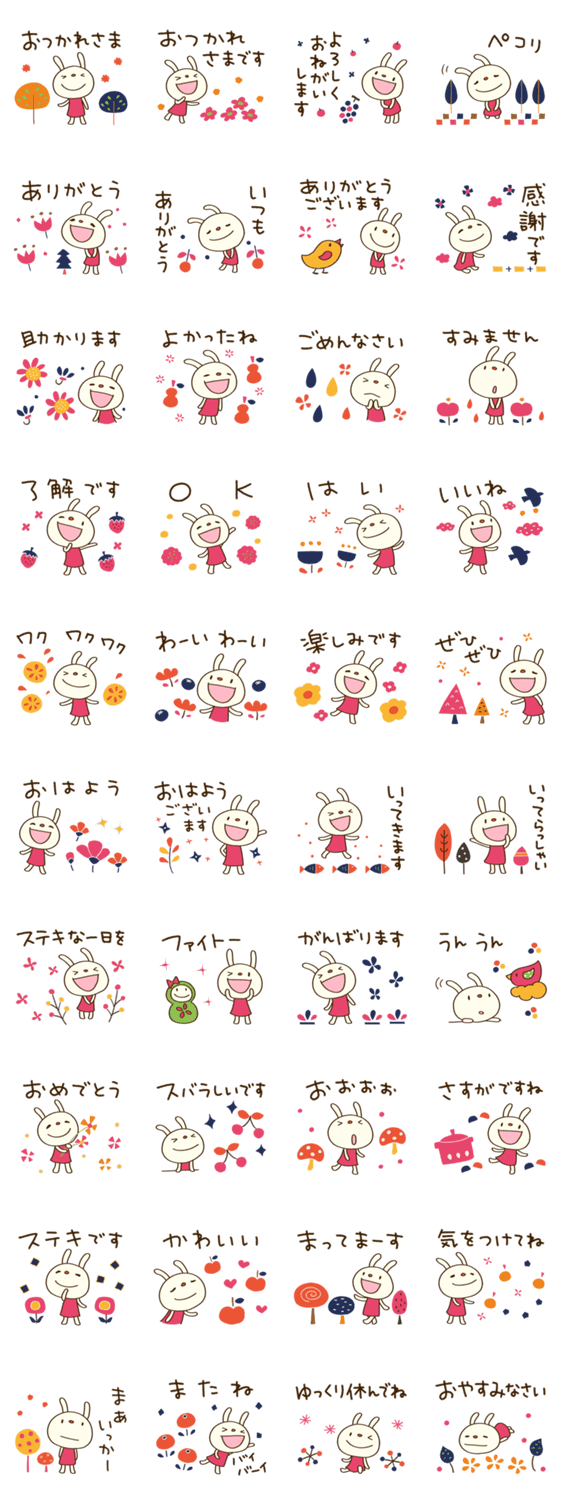 | スタンプ説明 | てるてるうさぎ。北欧テイスト。「感謝です」「おはよう」から「ステキです」まで。てるてるうさぎで、涼しげに気持ちを届けよう。 |
