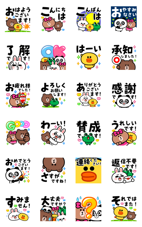 ブラウン&フレンズの飛び出す敬語スタンプ!でか文字だから見やすくて使いやすいよ!毎日の生活でよく使う定番の挨拶と返事がそろってまーす♪ ※BROWN & FRIENDS をみんなでつくろう!キャンペーン参加スタンプです