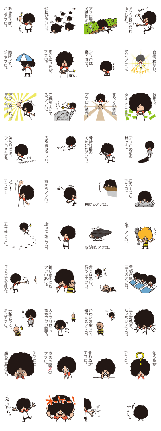 「自信、神なり、マジ、アフロ」。アフロでダジャレのことわざスタンプ降臨。意味不明なんて、言わぬがアフロ。ここぞ!の時にビシッとキメて、アフロ野となれ山となれ〜!