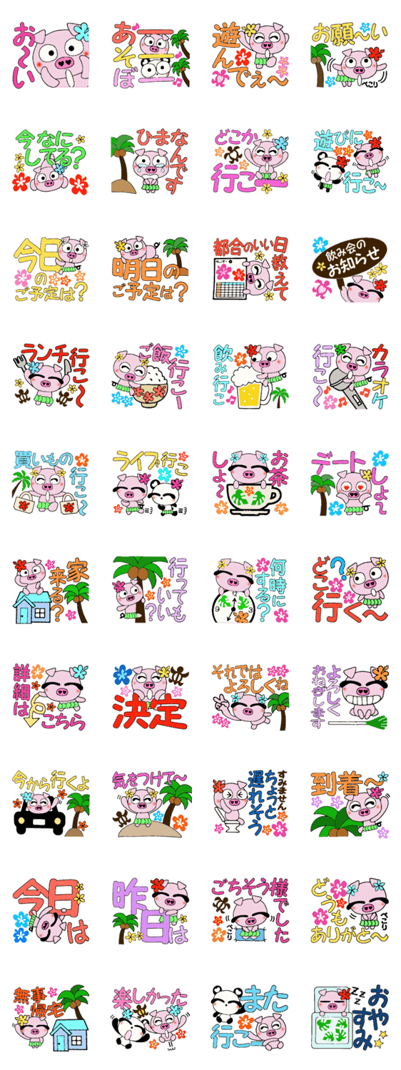 子豚のぶーはハワイアンが大好き。色々なお出かけやお誘いを集めました。文字付、セリフ付のお誘い編です。(ときどきダンパ登場だよ)