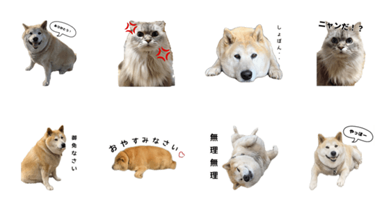 我が家のぽっちゃりで表情豊かな柴犬もどきのコロとモフモフでツンデレなチンチラとヒマラヤンのミックス猫マロンのスタンプです。