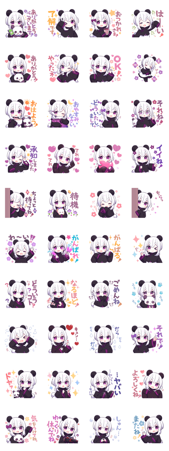 パンダの女の子の毎日使えるリアクションや挨拶が沢山入っています。友達や家族、恋人との会話に是非。