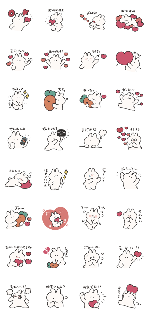恋人や大好きな友だちに送るのにぴったりなハート多めのうさぎときどきにんじんのスタンプです。こちらは文字入りです。
