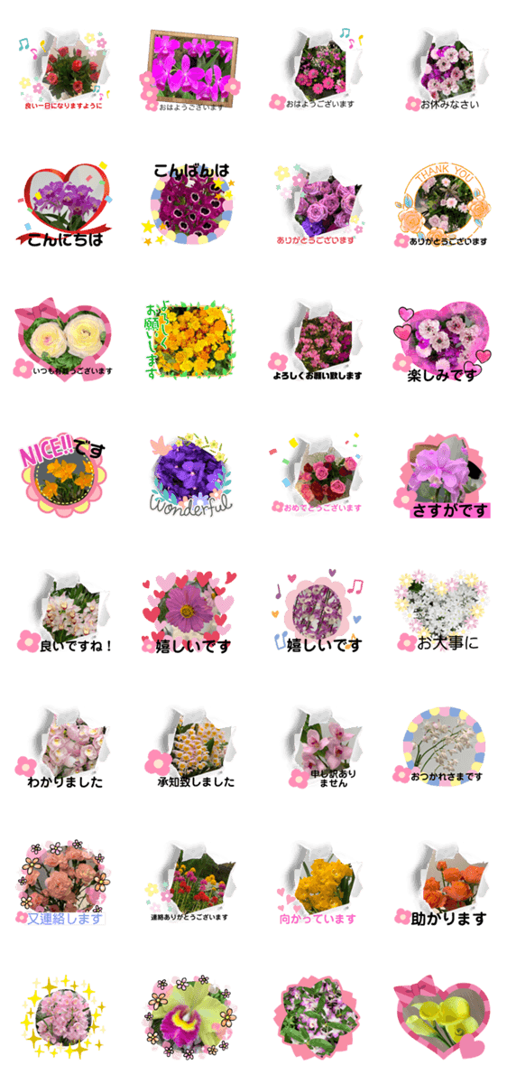 毎日使える挨拶を美しい花束を添えて贈るスタンプです。丁寧な言葉使いにしました。お花も蘭や薔薇が多くなっています。是非ご活用ください。
