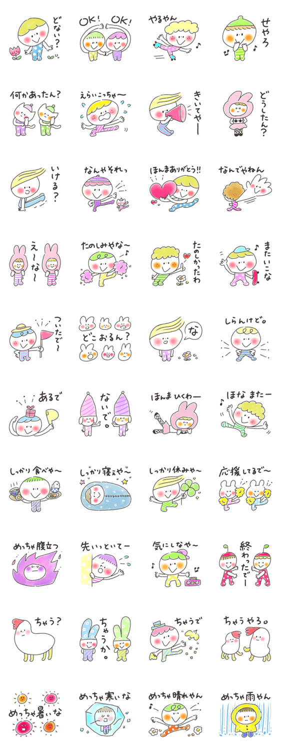 関西弁(大阪弁)のかわいいお友達が大集合!毎日使えるカラフルなスタンプだよ。暑い夏も寒い冬もみんなで一年中使ってね!