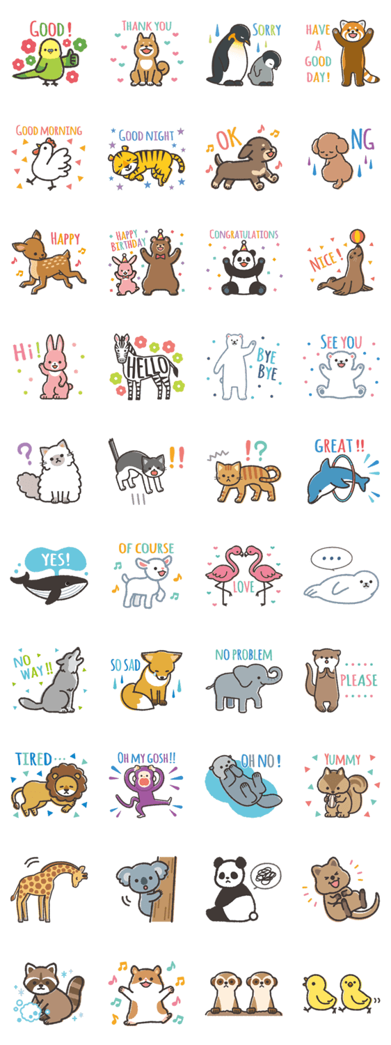 かわいい動物たちの使いやすい英語メッセージスタンプです。 シンプルなので大人の方にもおすすめです。 犬/ねこ/うさぎ/カワウソ/ペンギン/パンダ/イルカ/トリ などなど