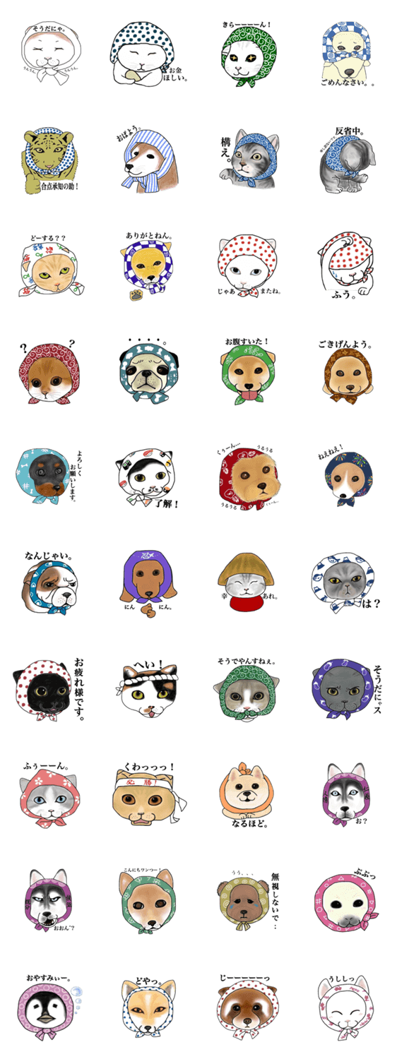 ほっかむりした動物たち、犬、猫いろいろ。ほんわかしてね。
