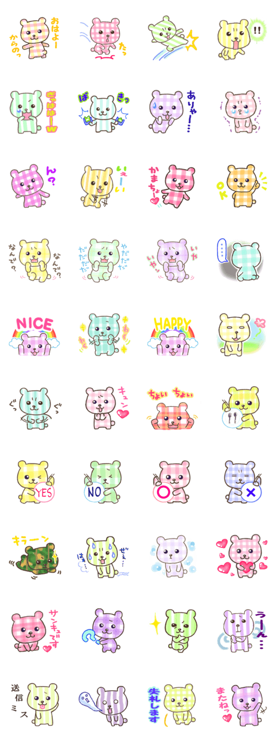 おっとりキュートなチェック柄のクマと元気でやんちゃなシマ模様のクマ、チェックマ&シマクマ。2匹は仲のいい友達同士。カラフルでかわいく、楽しいスタンプです。