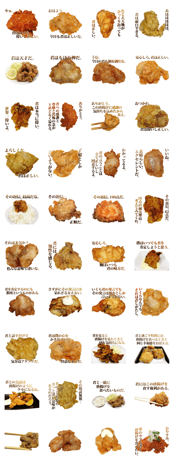 唐揚げがすべてを肯定するスタンプです。からあげで飯テロしつつ肯定すれば全て円満です。肯定は最強の言葉。鶏肉、揚げ物、フライドチキン。実写面白い食べ物シリーズ。