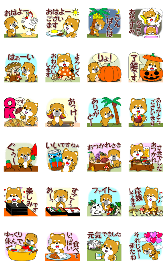 豆柴の親子が飛び出して動きます。 食べ物をモチーフのステッカーで、いつでも使える言葉を厳選しました。