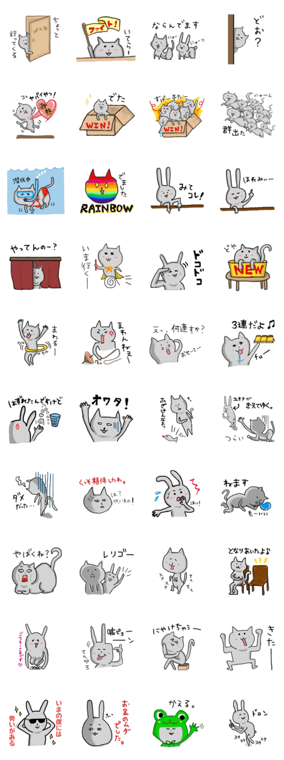 猫のネコパチさんとウサギのらびたそのスタンプです。趣味やゲームの結果報告などにどうぞ!