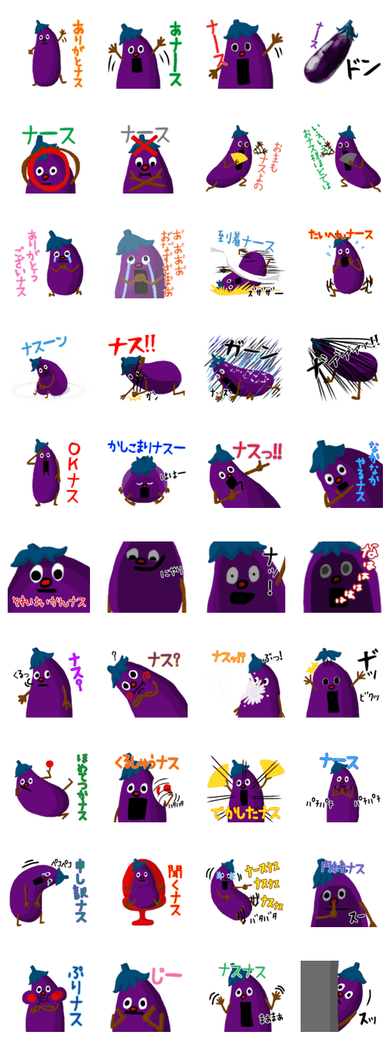| スタンプ説明 | おナスです。基本言葉は「ナス」ですが分かりやすい絵にしています。ありがとナスや申し訳ナスなどナス以外の台詞もあります。使いやすいので是非!!武士ぽいのも少々あり |