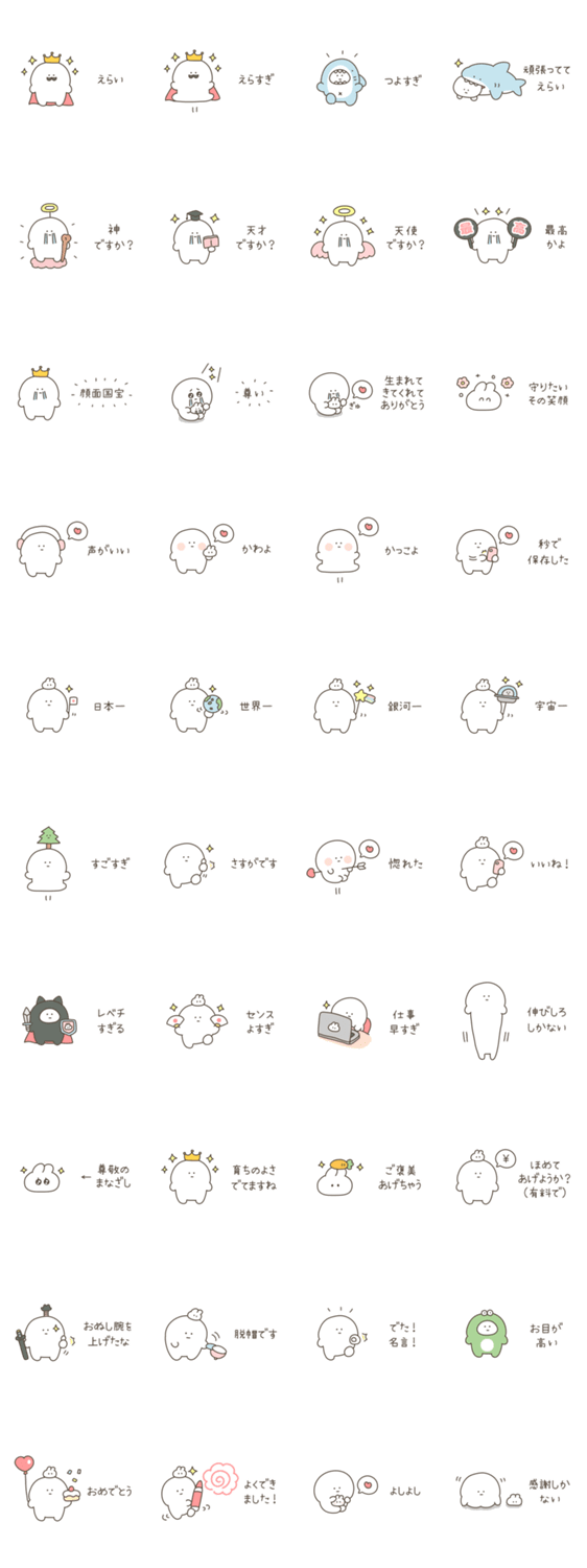 絶望ちゃんシリーズ褒める編。偉い/ポジティブ/太鼓持ち/最高/国宝/王様/ヒゲ髭/天才/神/天使/尊い/尊敬/名言/レベチ/推し/アイドル/声優/着ぐるみ/サメ/鮫/小さいスタンプ